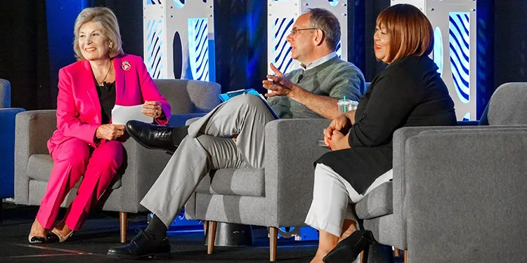 CPB President and CEO Pat Harrison, left, StoryCorps founder Dave Isay, and StoryCorps CEO Sandra Clark at the Public Media Development and Marketing Conference in Atlanta.